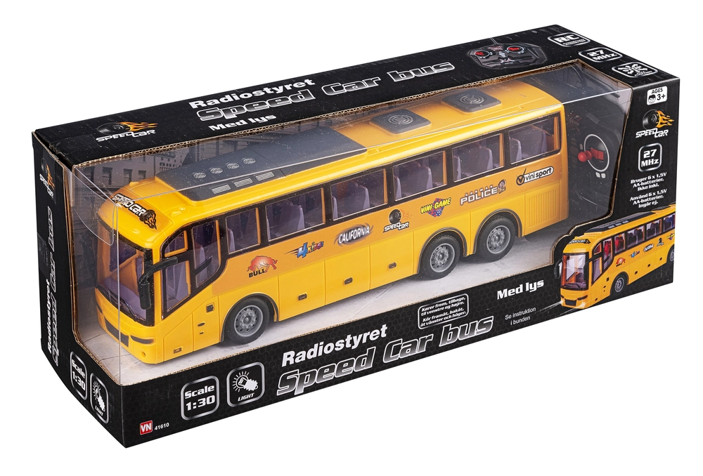 Radiostyret bus Med lys i forlygterne. Ekskl. 6 stk. AA-batterier. Aflevér brugte batterier korrekt og skån miljøet