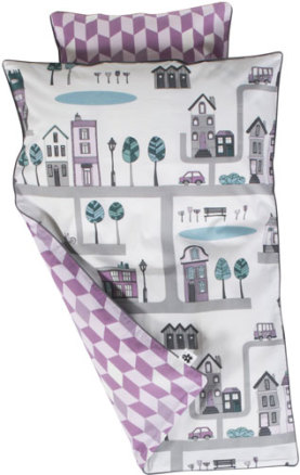 Så skønt og herligt sengetøj fra Sebra produceret af økologisk bomuld. Den ene side af sengetøjet er med søde print af huse og træer i pastel lilla farver og den anden side er med grafisk print i samme farve nuancer. Både pudebetræk og dynebetræk lukkes m