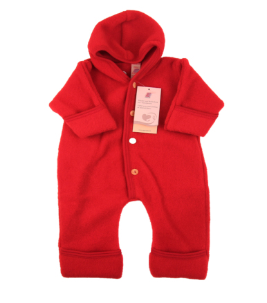 Skøn heldragt/flyverdragt fra Engel i det blødeste økologisk uldfleece i flot rød farve med hætte og ekstra ombuk ved hænder og fødder så disse er pakket godt ind. Barnet undgår hermed vanter og futter. Super anvendelig både til køreturen i bil, barnevogn