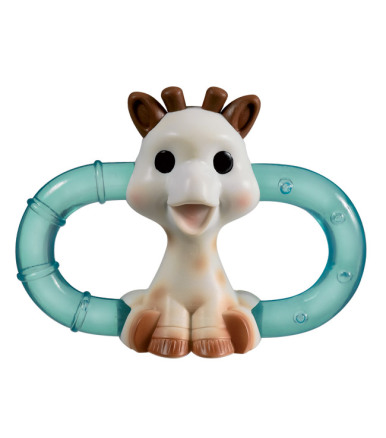 Sød bidering fra Vulli, i en kær Sohie Giraf udgave. Bideringen har to dobbelte sider fyldt med sterilt vand. Hvis bideringen lægges i køleskabet køles ringen ned og giver en let kølende effekt for de særlig ømme gummer. Sophie Giraf bideringen har riller