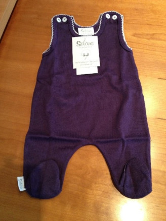 Skøn sparkedragt i 100% bomuld med fødder til de mindste. Super blød og i en lækker mørk lilla farve med fine hvide stiklinger. Baby vil elske at have den på.