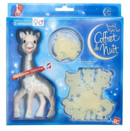 Sophie Giraf i blå, der lyser svagt om natten. Der medfølger 17 forskellige selvlysende figurer, lige til at hænge op på babys værelse så de lyser om natten. Ingen lyd i giraffen.